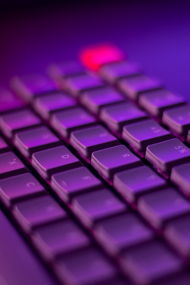 A detailed close-up of illuminated mechanical keyboard keys with focus on blue and purple lights.